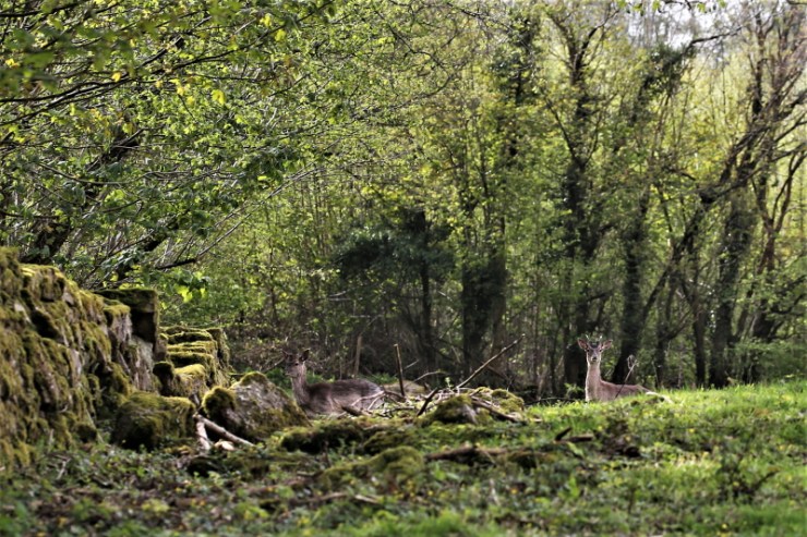 Soon though you come out of the woods and cross several fields, they are pasture, too steep for arable and populated by sheep and some horses. I also saw two Roe Deer on my visit at the end of April 2018.
